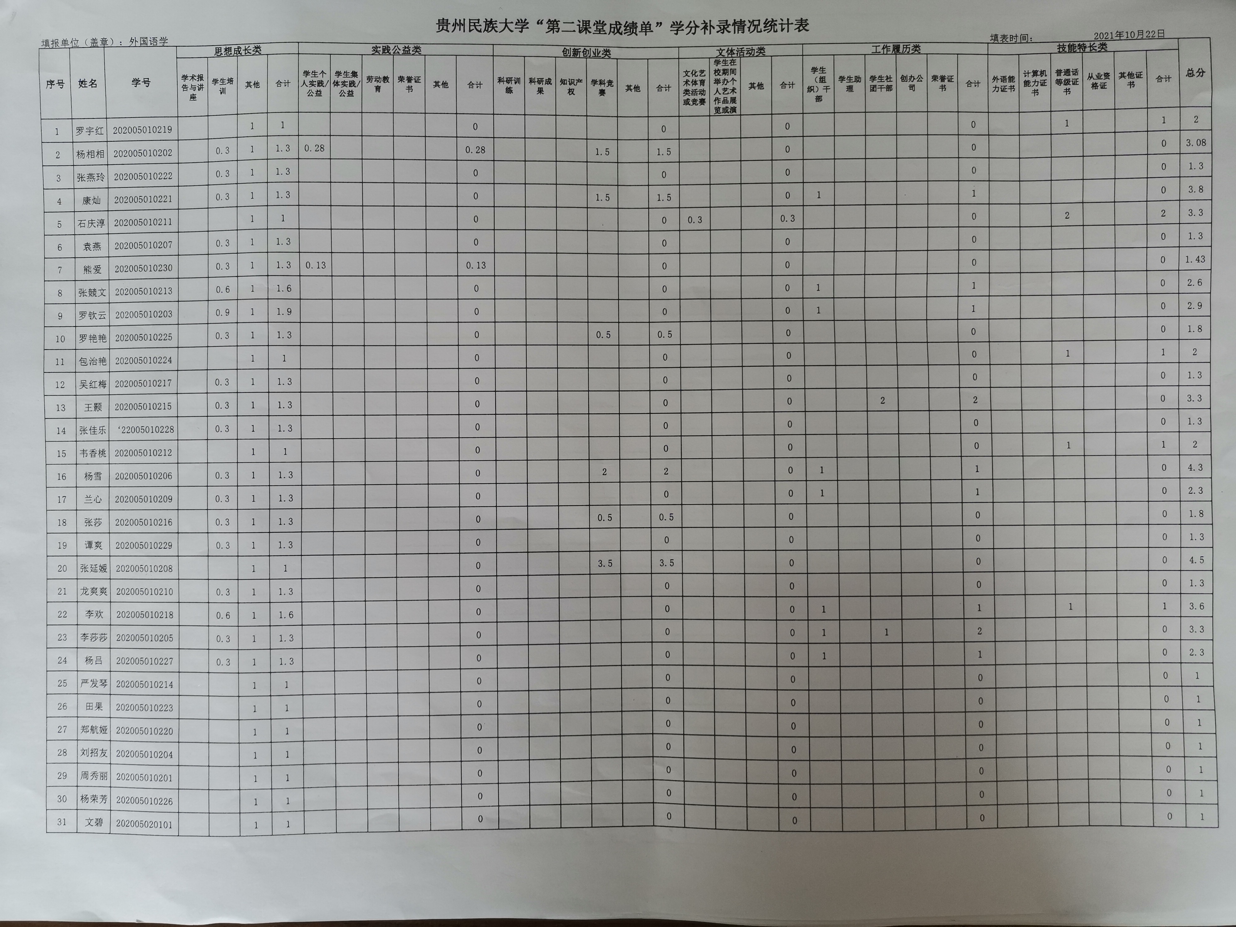 为进一步贯彻落实《教育部关于加快建设高水平本科教育全面提高人才培养能力的意见》(教高〔2018〕2号)文件、《高校共青团改革实施方案》和《关于全面加强新时代大中小学劳动教育的意见》精神,根据《贵州民族大学“第二课堂成绩单”制度实施办法》,现将多米官网平台_多米(中国)一站式服务官网2020级学生“第二课堂成绩单”补录学分公示如下:
