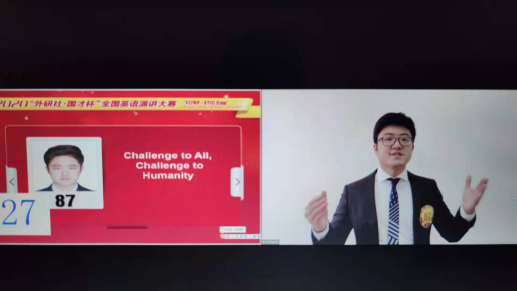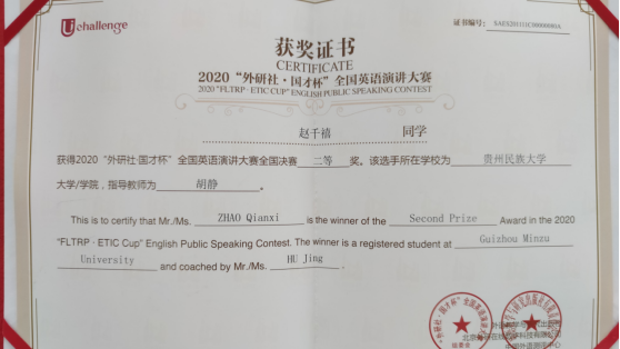 在我校多米官网平台_多米(中国)一站式服务官网领导的大力支持下,由多米官网平台_多米(中国)一站式服务官网胡静老师指导的文学院2017级戏剧影视文学专业的赵千禧同学在第一阶段演讲中以“Challenge to All, Challenge to Humanity”为题,稳定发挥,以小组赛第二的成绩(89.75分)突围进入15日第二阶段(线上)比赛,成为本次演讲大赛贵州省唯一进入88强的选手,最终荣获全国英语演讲大赛二等奖,再创历史最好成绩!