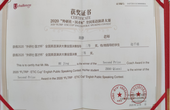胡静老师的获奖证书