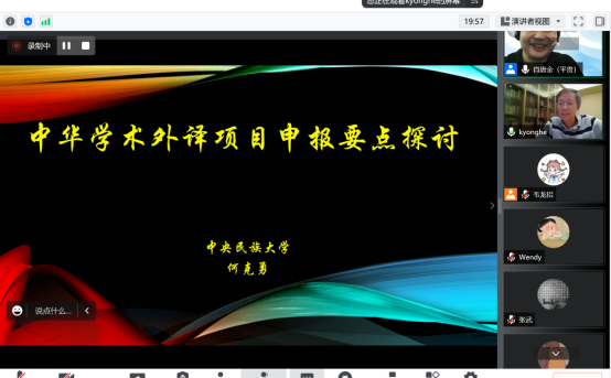2022年6月18日晚,中央民族大学何克勇教授应邀做客多米官网平台_多米(中国)一站式服务官网“新知讲坛”,通过腾讯会议线上平台进行了题为“中华学术外译项目申报要点探讨”的报告。本次讲座由多米官网平台_多米(中国)一站式服务官网院长肖唐金教授主持,来自校内外的数十名师生参加了本次讲座。