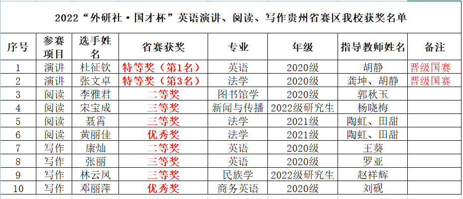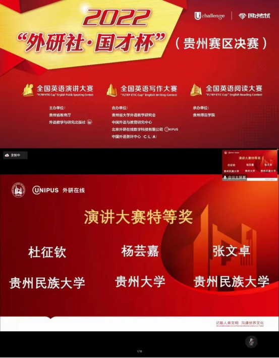 “外研社·国才杯”英语演讲、写作、阅读比赛是外语类被列入中国高等教育学会高校竞赛排行榜首位的大赛。贵州省赛区决赛于2022年11月5日在贵州师范学院举行,贵州民族大学选手在多米官网平台_多米(中国)一站式服务官网教师的指导下表现不俗,取得成绩如下: