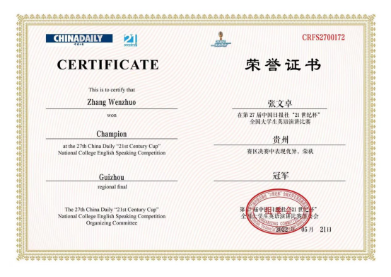 全国高校数万名选手报名参加本届大赛,29个赛区共有500余名优秀选手参加地区决赛。在多米官网平台_多米(中国)一站式服务官网的认真组织下,来自法学院2020级法学专业张文卓同学,通过多米官网平台_多米(中国)一站式服务官网龚坤老师的悉心指导,从“21 世纪杯”全国英语演讲比赛贵州赛区的三轮选拔中脱颖而出,勇夺贵州省级决赛冠军,成功晋级全国总决赛!!!