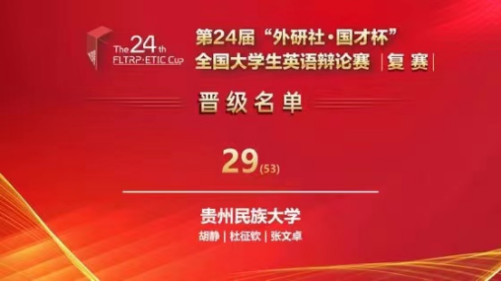 多米官网平台_多米(中国)一站式服务官网2020级英语专业杜征钦同学和法学院2020级法学专业的张文卓同学,在多米官网平台_多米(中国)一站式服务官网胡静老师的悉心指导下,在华南地区复赛中,经过4月16日和17日两天五轮的激烈比拼,荣获三等奖,成功晋级第24届“外研社·国才杯”全国大学生英语辩论赛全国总决赛,使贵州民族大学成为贵州省唯一获得晋级全国总决赛的高校。
