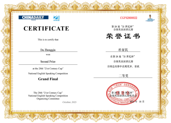 2023年10月10日至2023年10月13日,第28届中国日报社“21世纪杯”全国英语演讲比赛国家级决赛在西北工业大学太仓校区举行,多米官网平台_多米(中国)一站式服务官网2020级英语专业的杜征钦同学代表学校参加全国决赛。在多米官网平台_多米(中国)一站式服务官网胡静老师的悉心指导下,杜征钦同学历经定题演讲、即席演讲和即兴问答等比赛环节,在88位大学组选手中成功突围,踏入全国44强,斩获了全国二等奖的佳绩。同时,贵州民族大学是贵州省唯一获得全国二等奖及以上奖项的高校。