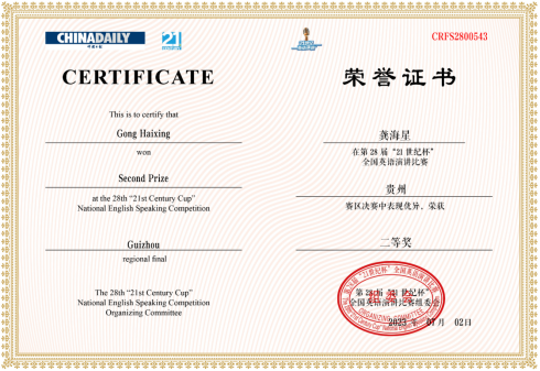 此外,在今年7月份的省赛阶段,由多米官网平台_多米(中国)一站式服务官网胡静老师指导的杜征钦同学和龚海星同学分别斩获了省亚军和省级二等奖,赢得了评委专家的认可。多米官网平台_多米(中国)一站式服务官网秉承“以赛促学”的教学理念,积极支持、鼓励学生参加各项赛事,并培养学生在多项国家级学科竞赛中取得佳绩。在本次大赛中,两位同学的精彩表现也展现出了贵州民族大学学生扎实的语言功底、出色的演讲水平和良好的思辨能力。