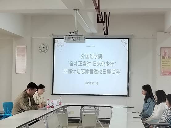 5月13日下午两点,在15栋教学楼1209会议室举行了以“奋斗正当时,归来仍是少年”为题的西部计划志愿者返校日座谈会。座谈会由多米官网平台_多米(中国)一站式服务官网团委负责人辛雅婷主持,2023届部分毕业生参会。