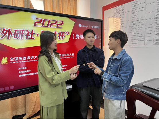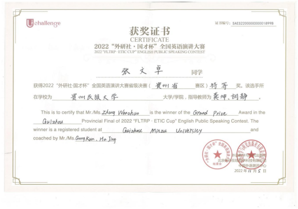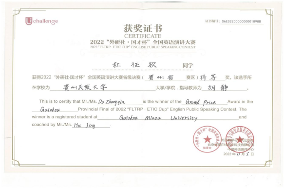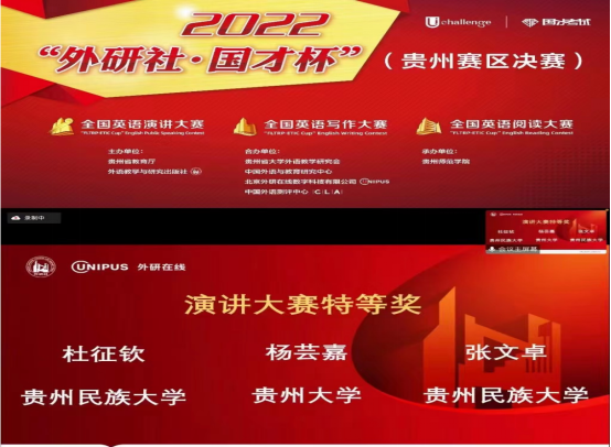 2022年11月5日“外研社·国才杯”英语演讲大赛贵州省赛区决赛在贵州师范学院举行,贵州民族大学选手在多米官网平台_多米(中国)一站式服务官网教师胡静、龚坤的指导下喜获佳绩:杜征钦和张文卓从49名决赛选手中脱颖而出,摘取冠军和季军,均获省级特等奖,成功晋级全国总决赛!