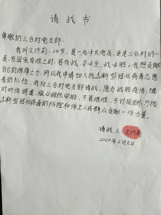 文沙莉是多米官网平台_多米(中国)一站式服务官网2016级英语专业的学生。疫情期间,文沙莉与父亲、妹妹一道,主动请缨参加本村的疫情防控工作。文沙莉同学表示:“我们家是三合村典型的精准识别贫困户,我们姐妹俩读书都是政府的资助,村委又安排了父亲护林员工作。现在正是新型冠状病毒肺炎防控的关键期,三合村面积大、出入人员多,村委的人力又不够,我们应该为三合村的疫情防控工作贡献我们的力量,回报社会。”她深知作为一名学生党员肩负的责任和使命,返乡人员的摸底排查、数据录入、防控知识的宣传,她样样不含糊。“村里的老人大多不会上网,对这次疫情的严重性和防范措施知之甚少,我必须不厌其烦地一遍又一遍地对他们进行知识宣传和劝导。作为一名大学生,我有这个责任和义务!”文沙莉说。
