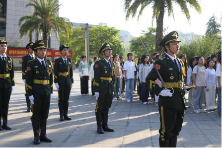 7点半,升旗仪式正式开始,英姿飒爽的国旗护卫队队员们迈着整齐有力、铿锵坚定的步伐,护送鲜艳的五星红旗走向升旗台。他们身姿挺拔、目光如炬,每一步都踏出了对祖国的忠诚与热爱,展现出新时代青年的蓬勃朝气和庄重使命感,令在场师生深受感染。
